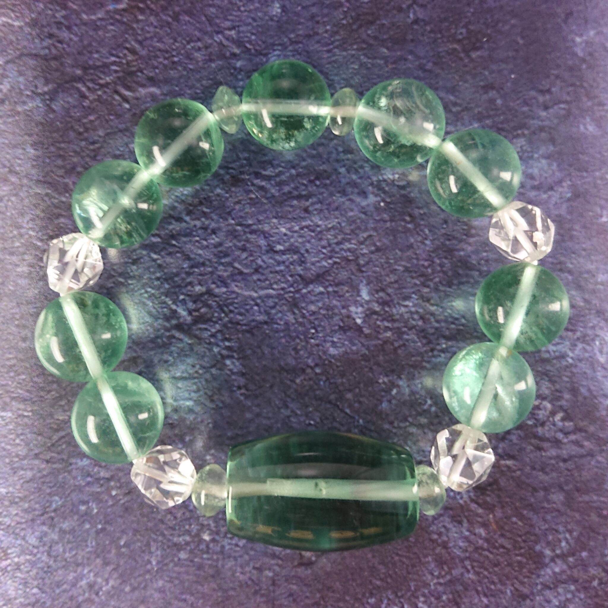 フローライトは色別にエネルギー的特性が多少異なりがあるようで、パープル系は明晰性や感受性を高める傾向、グリーン系は癒し的に働き、グラデーションカラーのものは、想像力を高める傾向が強いようです。